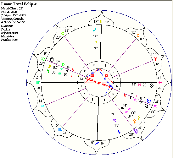 The second consecutive Full Moon in Scorpio occurs 19 May 2008 @ 4.44 pm pdt, just before the Sun enters Gemini. Note that Saturn has gone direct and sits on the same degree as the Full Lunar Eclipse of 20 February 2008 @ 7:26 pm. pst. It is also in almost precisely the same position as it was in the April chart.