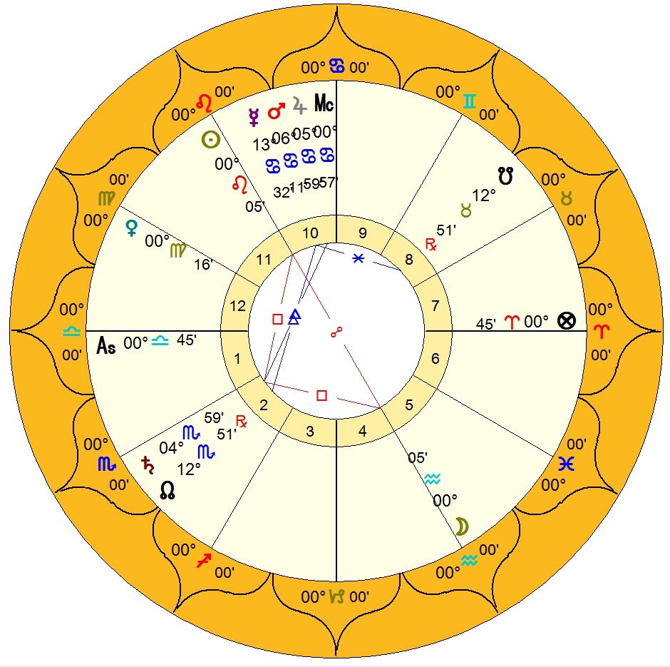 All in all this is a highly auspicious chart signalling new beginnings on multiple fronts. The string of planets in Cancer is a heady mix and a very volatile one at that. Mercury with Mars can be compared to rocket fuel, all well and good if properly directed. Mars in his Fall conjunct Jupiter in his exaltation is associated with floods.