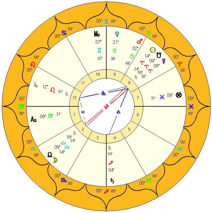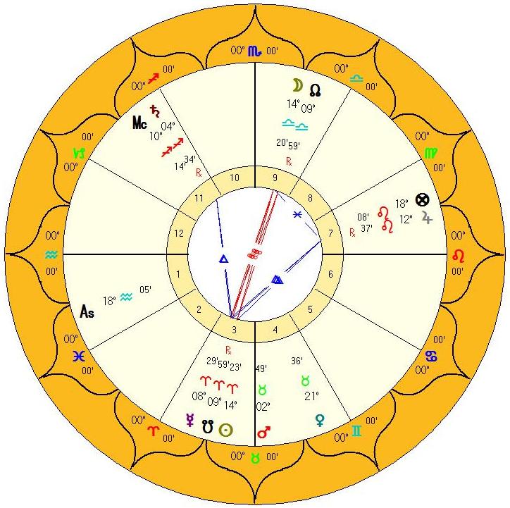 The chart is also distinguished by the  presence of Antares, the heart of the Scorpion, conjunct the M.C,,