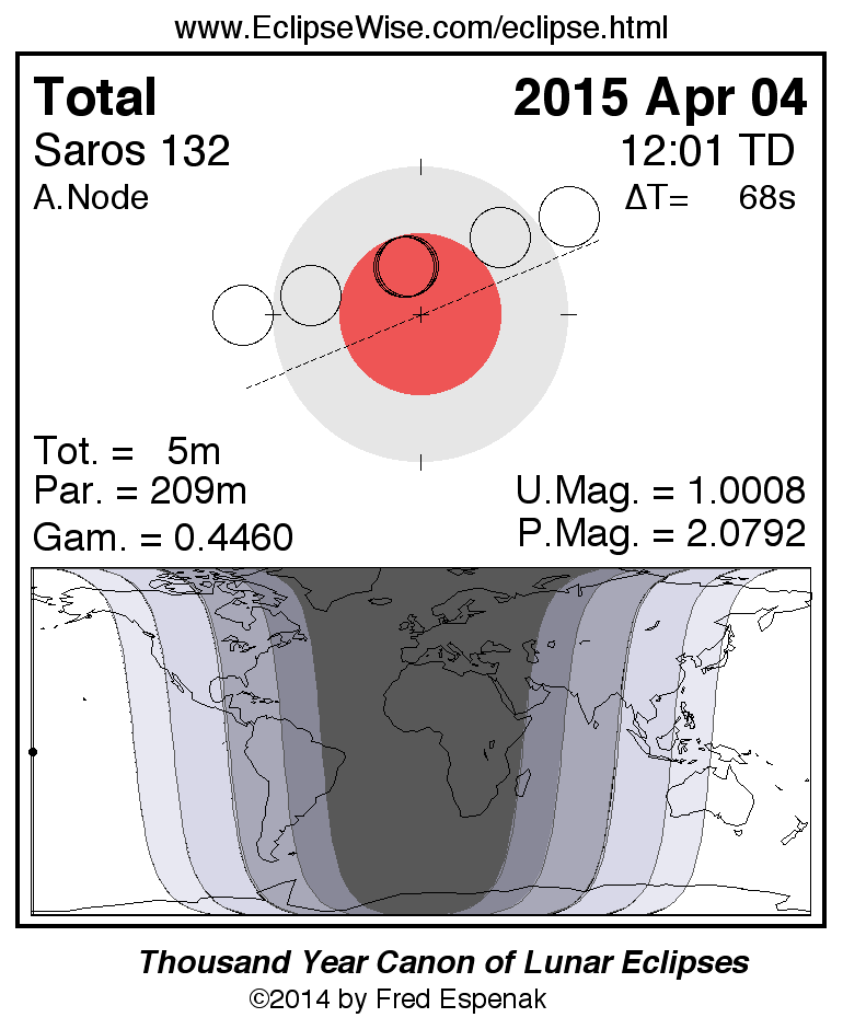 [The eclipse begins at 3:16 AM Pacific Daylight Time on the morning of April 4th when the edge of the Moon first enters the amber core of Earth’s shadow.  For the next hour and 45 minutes, Earth’s shadow will move across the lunar disk, ultimately swallowing the entire Moon at 4:58 AM PDT. “Totality” is when the Moon is fully inside Earth’s shadow. Some total eclipses last for more than an hour.  In this case, however, totality spans just 4 minutes and 43 seconds—a result of the fact that the Moon is skimming the outskirts of Earth’s shadow rather than passing centrally through it.] – Courtesy of NASA