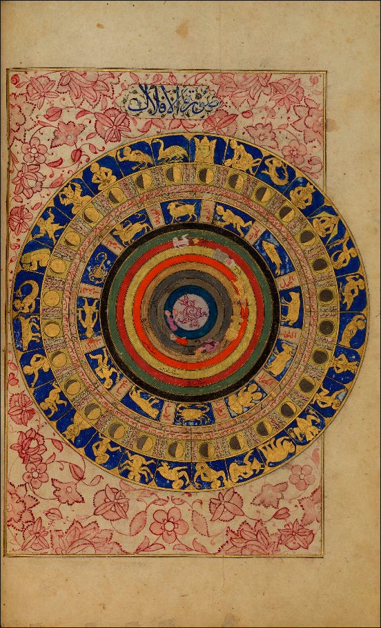 Celestial map, signs of the Zodiac and lunar mansions in the Zubdat-al Tawarikh, dedicated to the Ottoman Sultan Murad III in 1583