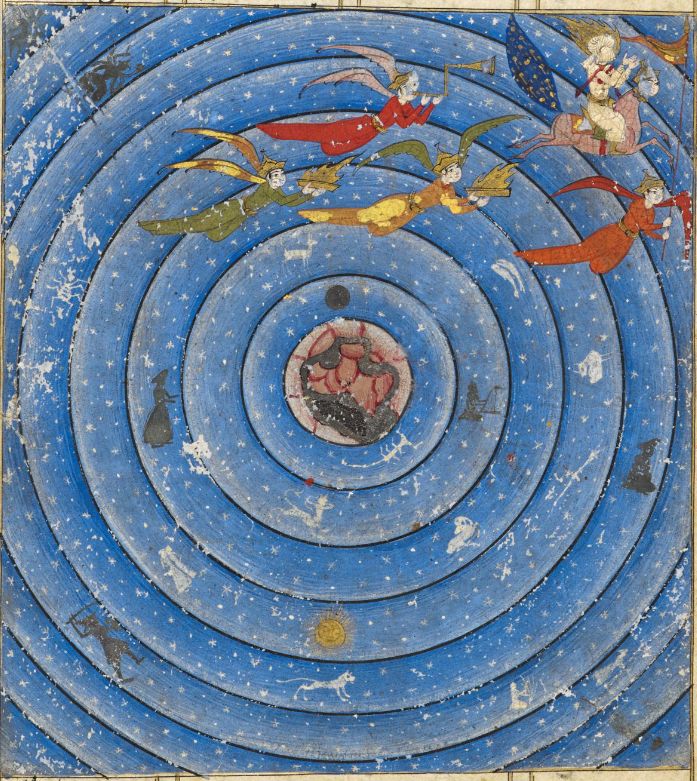 Above, we what is essentially the sane theme found in the previous paintings, but with a slight twist. This Persian Sufi painting describes the Night Journey of the Prophet. This work is far more complex than first meets the eye. The painting has deteriorated, but we can still see the planets, represented anthropomorphically. The Sun and Moon are represented as disks. occupying the first and fourth sphere, as per the Chaldea order. We can also see the constellations, but they are projected in such as a way that we have the illusion of looking through the spheres. Remember that this is illustrating Muhammad’s mystical Night Journey.