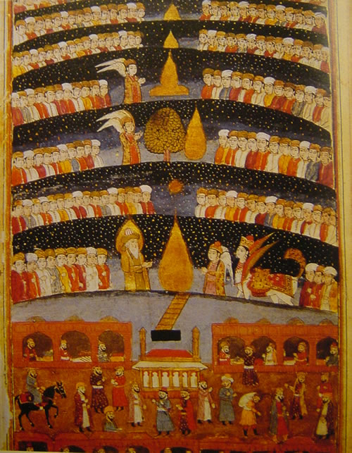 Although the style is very much Turkish and Islamic in style, it is entirely recognizable as what has become known as the Ptolemaic Universe, The relationship between this cosmology and the Night Journey of Muhammad will become clear.