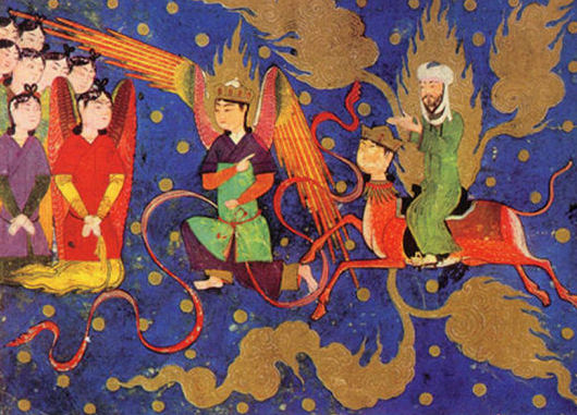 Muhamad’s Night Journey is in Sura Al Nisra of the Quran and further embellished in the Hadiths It’s controversial these days. Many modern Muslims consider this to be a literal event that occurred at a particularly time and place. – The Prophet rides on Buraq as is taken to Jerusalem where he ascends to meet the various Prophets from what is now known as the Dome of the Rock.