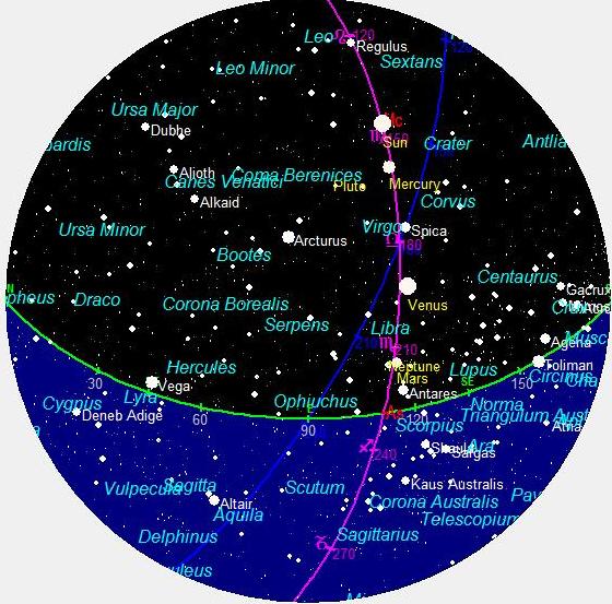 In the chart below, we find the Sun on the MC in his own domicile with Regulus. The previous Superior Conjunction had been in Leo. There was a change in triplicity but the water triplicity went back to 165 BC.