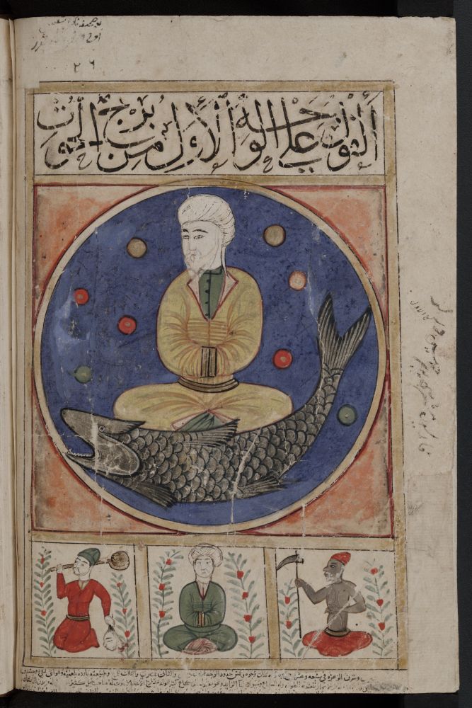 Pisces in the horoscope of Timurid Prince Iskandar, Islamic miniature, 1411, Iran – Wellcome Library, London You can see that the fish are not tied together. We can see the cord (rivers) in the background.