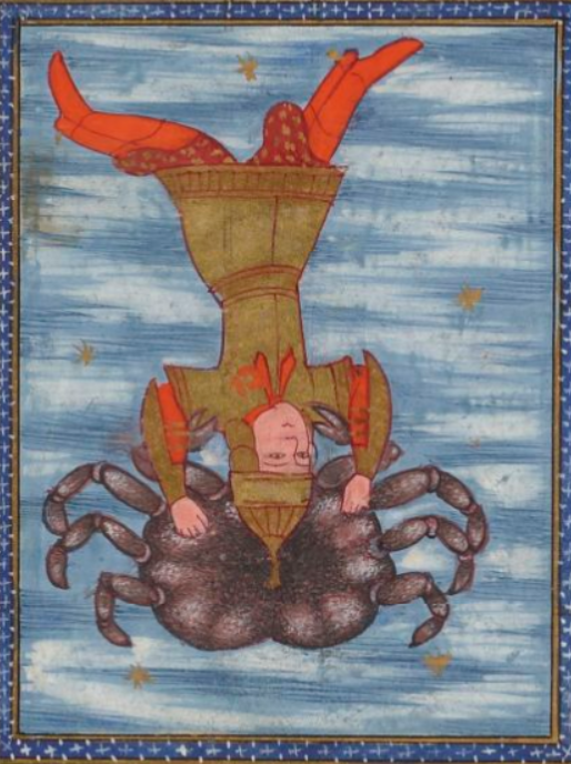 “Shining at the hinge of the year by the blazing turning-point which when recalled the Sun rounds in his course on high, the Crab occupies a joint of heaven and bends back the length of day. Of a grasping spirit and unwilling to give itself in service the Crab distributes many kinds of gain, and skill in making profits; he enables a man to carry his investment of foreign merchandise from city to city and, with an eye on steep rises in the price of corn, to risk his money upon sea-winds; to sell the world’s produce to the world, to establish commercial ties between so many unknown lands, to search out under foreign skies fresh sources of gain, and from the high price of his goods to amass sudden wealth. With heaven’s favor he also sells seasons of idleness at rates of interest to his liking, wishing the swift passage of time to add to the principal. His is a shrewd nature, and he is ready to fight for his profits.” [Astronomica, Manilius, 1st century AD, book 4, p.235.]