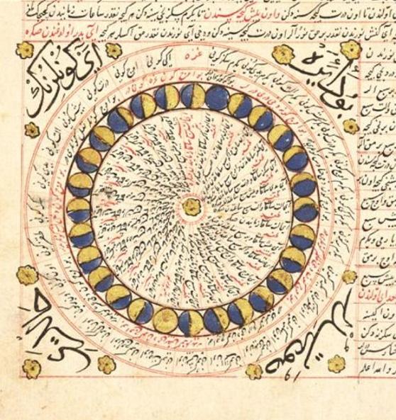 The image shows the phases of the moon in a month. This is a page taken form a calendar prepared by Sayyid Ahmed b. Mustafa Al-La’li, who presented this calendar to the Sultan Selim II in 1566. Courtesy of Sam Fogg – London.
