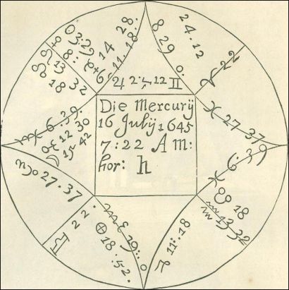 The image above is a simple reference tool – one can readily see the correspondences between the parts of the human body and the sign to which they are associated. For it to make any practical sense for an individual, we use the natal chart. In Lilly’s day, it would look something like this.