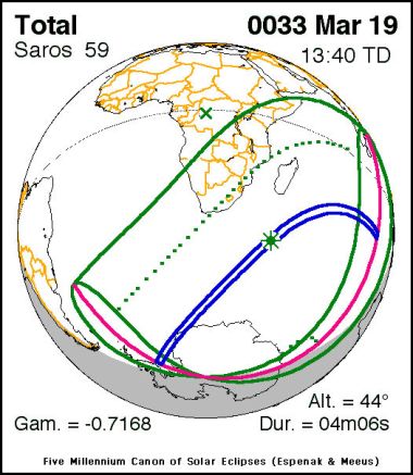 Many scholars have fallen victim to the expected date of the crucifixion, which we associate with Passover and sure enough, there was an eclipse in that general temporal vicinity. That was the Total Eclipse of March 0033 March 19 (Saros 59)