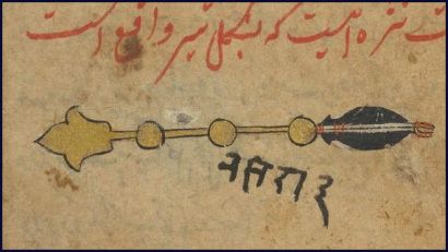 The 1st lunar mansion of Cancer: الذِّرَاعُ “al-dhirā`” (the Lion’s paw) in Arabic. पुनर्वसु “Punarvasu” (The Two Restorers of Goods) in Sanskrit. Symbolized by a bow and quiver full of arrows in Jyotish. From [Wellcome MS Persian 373] Thumbnail 193 of Nujum al-‘Ulum ‘Stars of Sciences’ copied from an earlier work (dated AD 1575), which was probably commissioned by ‘Ali’ Adil Shah II of Bijapur in India. [Wellcome MS Persian 373]