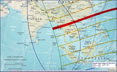 Let’s examine the details of the eclipse. It passes over very few countries, over the open Pacific Ocean, until it hits Taiwan, Hong Kong and South China. It then passes over Hanoi. Mundane astrologers sometimes use the astrological chart either of the dates of foundation for the city or else the quality assigned to a region by Classical sources. We don’t have any Western sources for historical Hanoi or North Viet Nam. What we are given is a variety of dates based on modern occurrences, such as political events. Clearly, this would be useless when considering the Vietnam of the late 18th century.
