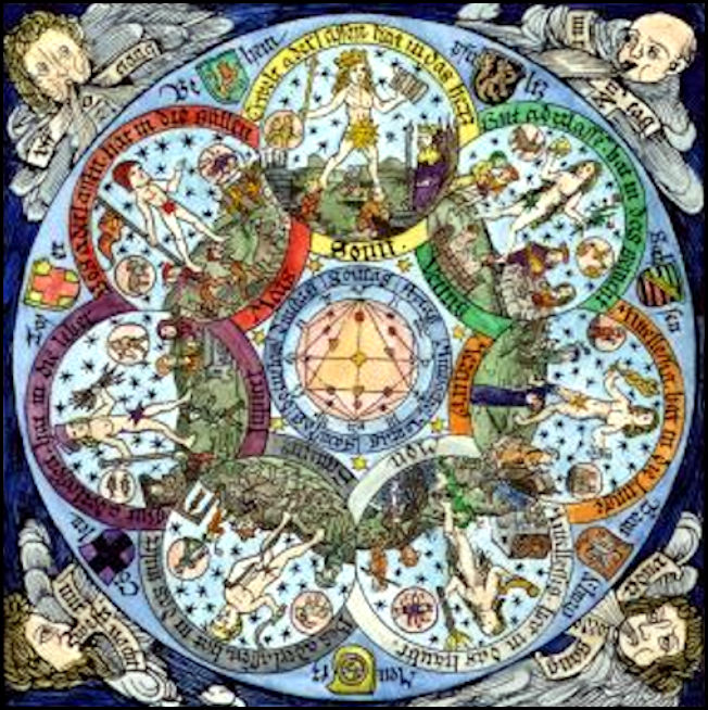 The seven planets with their associated symbols, within the four winds. – 15th-century astrological woodcut.