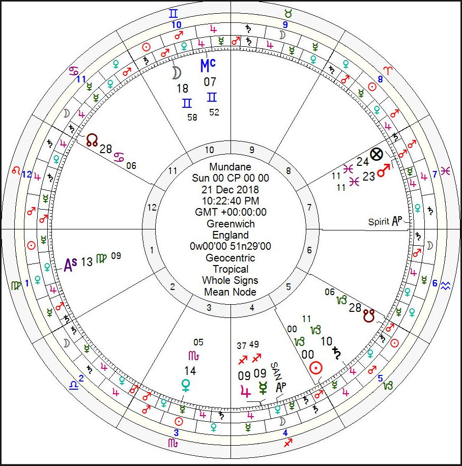 It’s that time of year again when we celebrate the longest night of the year in expectation of the waxing light force. I have mentioned before, that I believe the four Solstice and Equinoctial point should be primarily a time of celebration and reflection. I would, however, like to take this opportunity to look at the chart for the exact moment of the Winter Solstice. Because all the said points occur in Cardinal Signs, we can expect that each will have maximum influence over the following three months, unless some other element, such as a potent eclipse occurs in tandem. Here we have the chart for the Solstice in Greenwich.