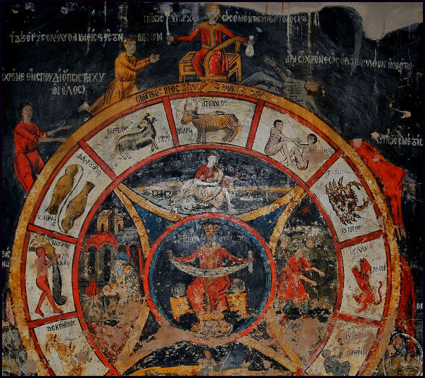 Church of the Nativity in the village of Arbanasi, in Veliko Tarnovo, north-central Bulgaria, there is a similar zodiac fresco image — a “Wheel of Time” in which the cycle of human life is represented: