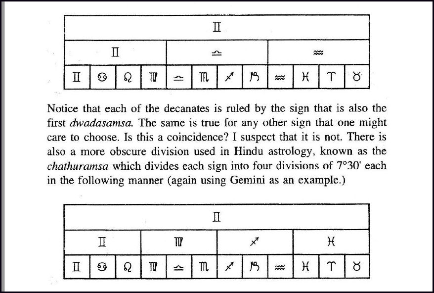 “The lunar mansion or nakshatra is 13°20’ long. This is very close to the average daily motion of the Moon in the zodiac, and it is well known that this is the derivation. The navamsa is exactly one-quarter of that and therefore resonates to the passage of the Moon through the quadrants of the chart. On average the Moon moves very close to 3°20′ of arc while it is rising from the Ascendant to the M.C., from the М.С. to the Descendant and so forth. ” Moreover, he uses two methods to establish the Ascendant in a horoscope, now known as A and B. They are closely allied with Babylonian astrology.