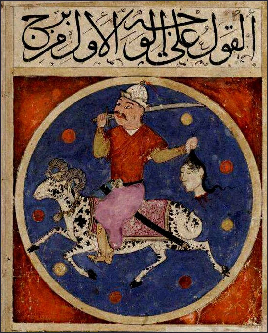 Mars is less agitated in his nocturnal domicile, as the night is said to cool his burning rage. In Aries, there is no holding back. The Islamic representations of Mars almost always portray him carrying a severed head with apparent glee. Mars in Aries is like a rambunctious and aggressive adolescent one a good day and far worst on a bad one. However, there is mercifully no guile in this placement,. This is unlike Mars in Scorpio. He is direct and sure of the rightness of his cause, entirely unconcerned what others may think of that.