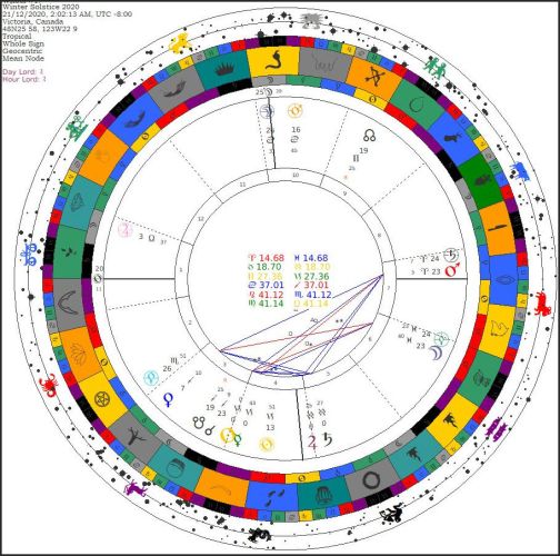 The chart which appears here is set for Victoria, BC Canada. The header image is taken from the Vancouver Lantern Festival celebrated on the other side of the Straight of Georgia. I write this in thoughtful contemplation and good cheer on Vancouver Island, on the Eve of the Solstice and the day before the perfection of the Jupiter/Saturn Grand Conjunction.