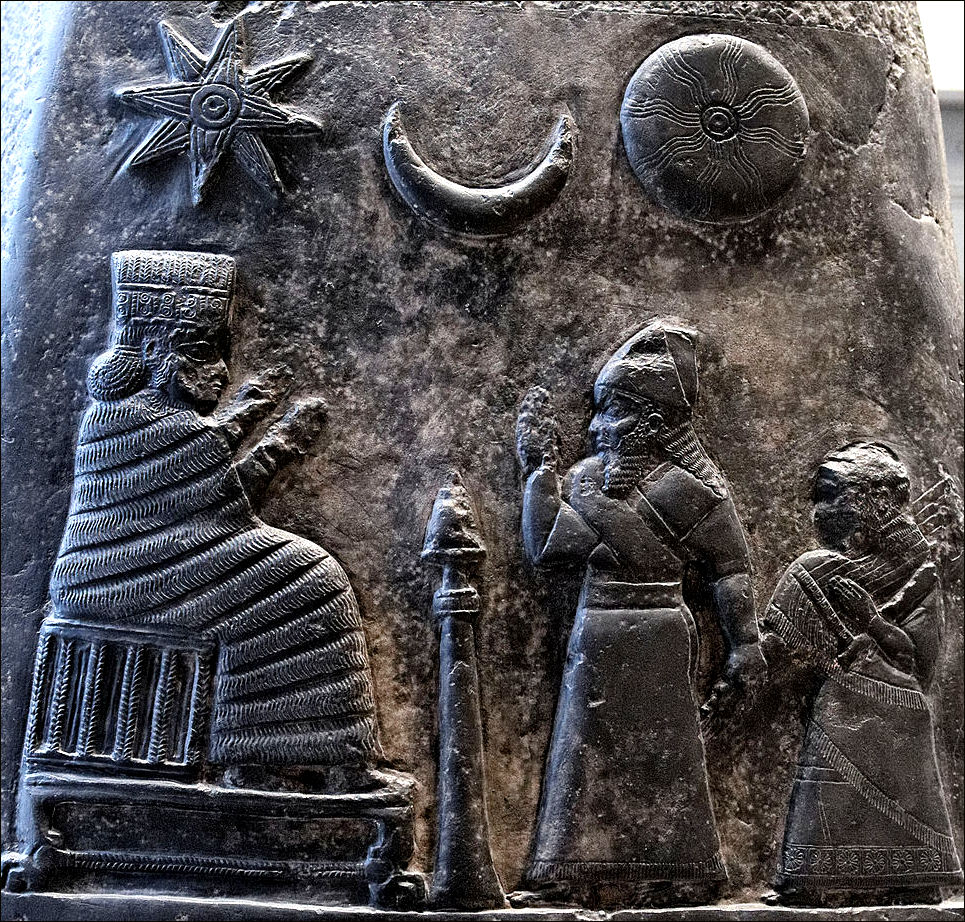 1024px-Kudurru_Melishipak_Louvre_Sb23_n02 Published March 21, 2023 at 965 × 922 in ARIES INGRESS OF THE SUN – 2023 Here the eight pointed star is the Star of Ishtar, the Babylonian Venus goddess, alongside the solar disk of her brother Shamash and the crescent moon of their father Sin on a boundary stone of Meli-Shipak II, dating to the twelfth century BC