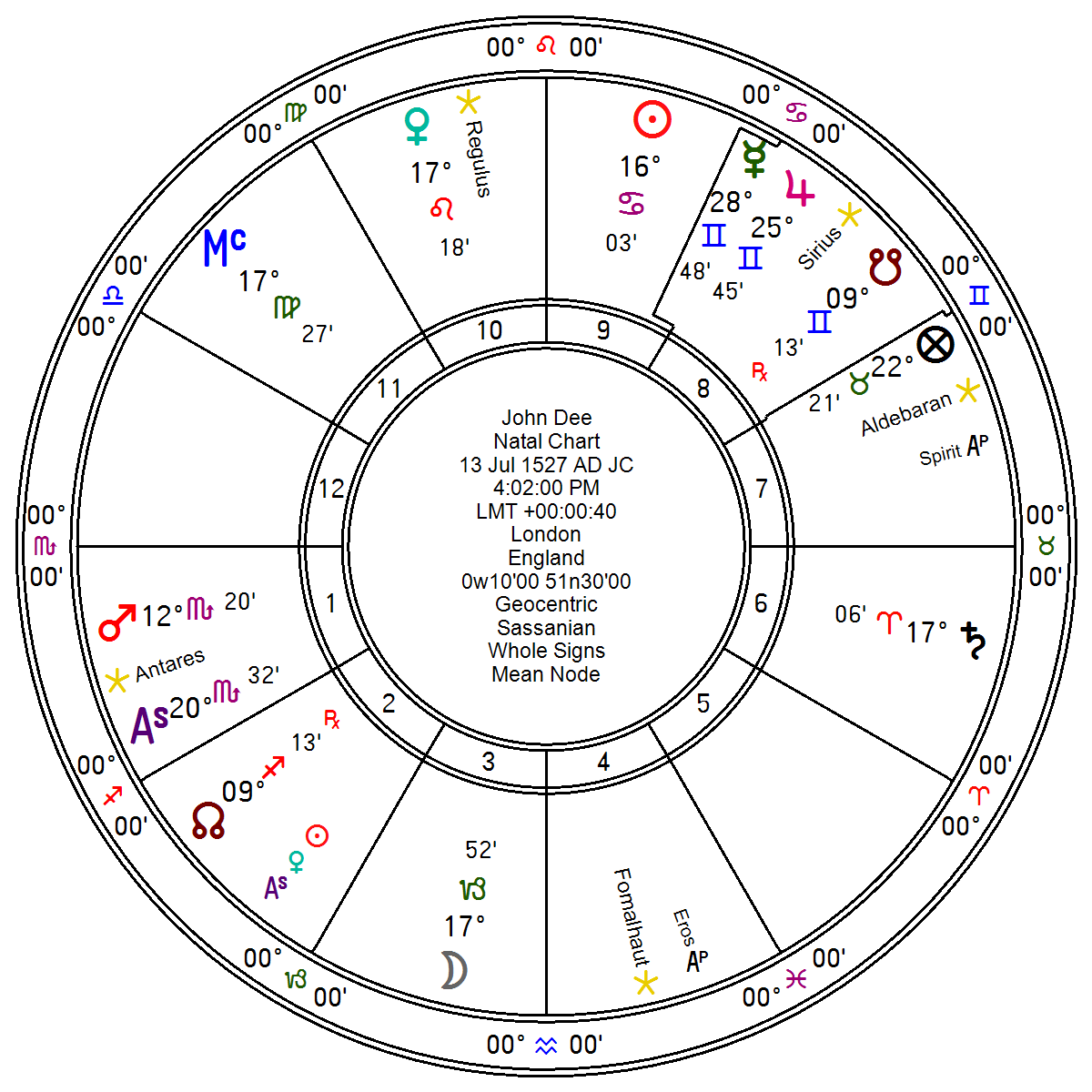 Several years ago I published a brief article on the Nativity of John Dee. At that time, I questioned the accuracy of the chart using house systems other than Whole Sign in particular. I had not yet developed my current interest in sidereal astrology, but even then I sensed problems with the most widely circulated chart. More recently, I had cause to reconsider the nativity in light of my current interest in Persian astrology and the Sassanian Ayanamsa.