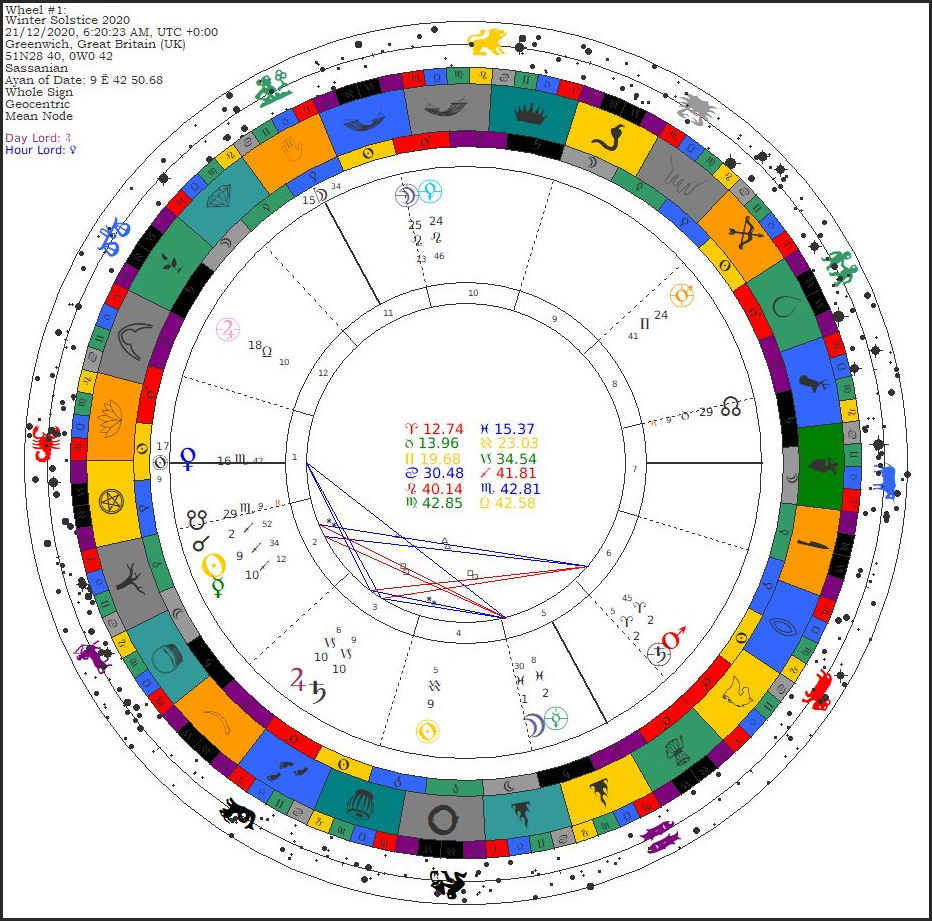 You will notice that this occurs within a few minutes of arc after the precise moment of the Winter Solstice. We cannot read the chart for the Grand Conjunction without considering its timing on the Solstice and we should not attempt to interpret the Solstice without regarding the integral element of the Conjunction.