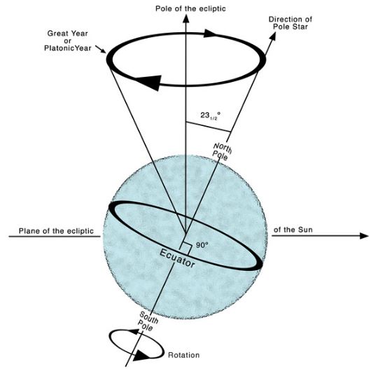 The motion of the equinox along the ecliptic, the plane of the Earth’s orbit, is caused by the cyclic precession of the Earth’s axis of rotation. In the process of compiling his famous Star catalogue, completed in 129 BC, Hipparchus observed that the position of the stars had shifted in a systematic way from earlier Babylonian / Chaldean measures. The noted difference was a slight but systematic difference in the longitudinal positions of the stars. What he was seeing was the precession of the equinox that causes the apparent position of stars to change from one century to another, at a fairly predictable rate. The accepted modern value for the precession is 0.01396 degrees per year. This means that the line of the equinoxes rotates completely around 360 degrees over 26,000 years. This cycle, known as the Platonic Year, is stabilized by the Sun and Moon The apparent drift is slow enough to be barely noticed in a lifetime, with an approximate value of 1° every 72 years.