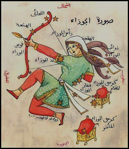 • Hello Diane, the page reproduces the Mansions according to Agrippa. None of the images is from his work, but are roughly contemporary. The first image is a photo of an astrolabe, the painting is an Islamic portrayal of Orion. You can see Betelgeuse at the end of his sleeve. The circle of the Mansions is adapted from Ibn Arabi. I’m not sure what you are referring to regarding Libra, but of you, could clarify. I would be happy. “Ajaib al-Makblukat”) by al-Kazwini, late 14th century