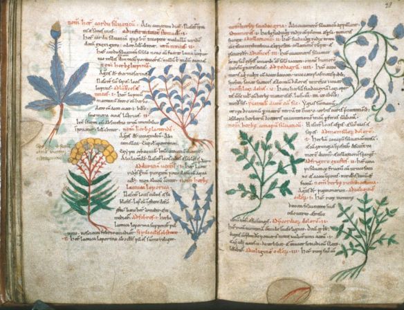 Lupinum (lupine), depicted on the left page, top right-hand side from Pseudo-Apuleius Herbal, 11th century Bodleian MS Ashmole 1431, fols 27v-28r.