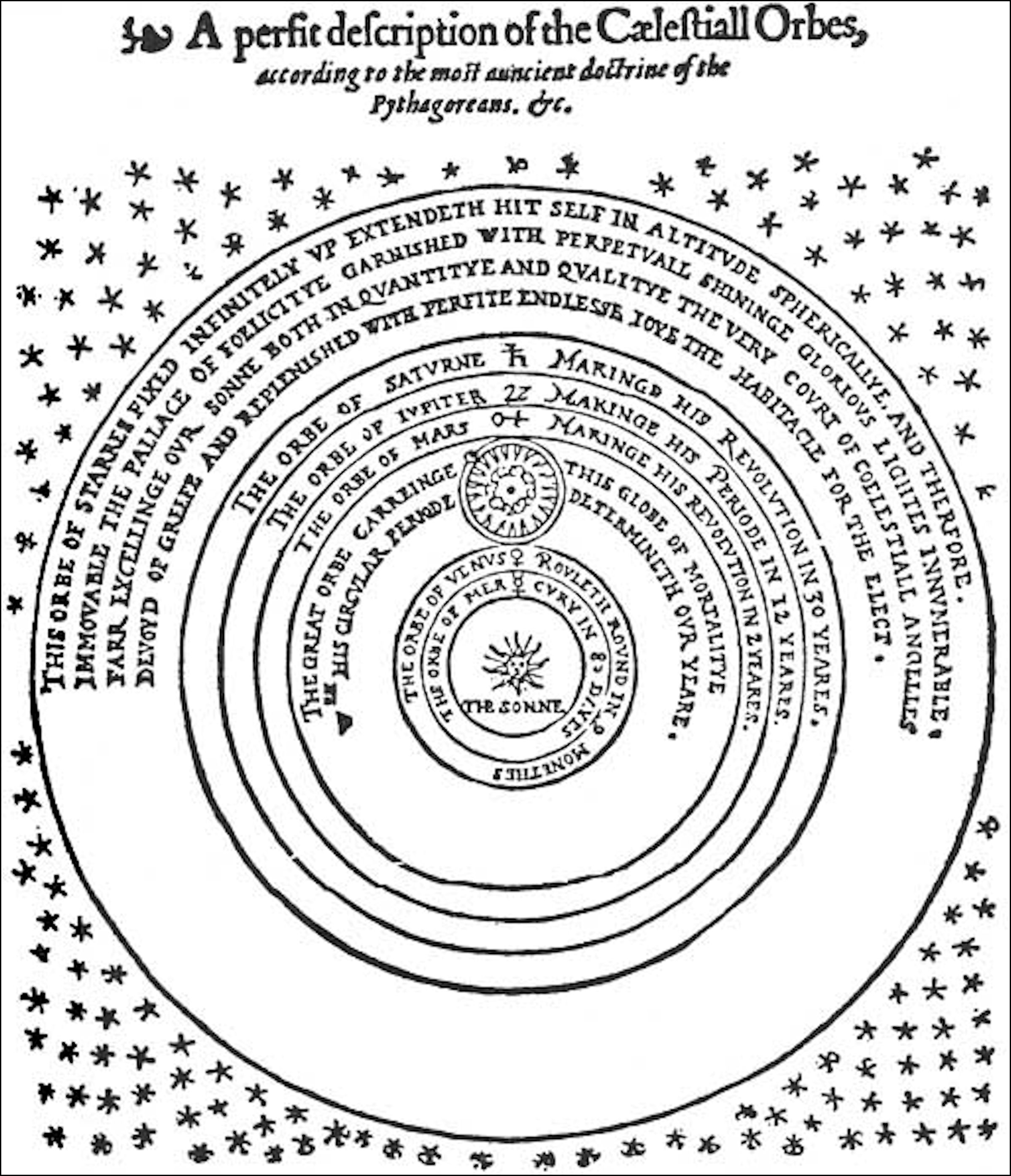 Having of late (gentle reader) corrected and reformed sundry faults that by negligence in printing have crept into my fathers General Prognostication, among other things I found a description or Model of the world, and situation of Spheres Celestial and Elementary, according to the doctrine of Ptolemy, whereunto all Universities (led thereto chiefly by the authority of Aristotle) sithens have consented. But in this our age, one rare wit (seeing the continual errors that from time to time more & more have bin discovered, besides the infinite absurdities in their Theorickes, which they have bin forced to admit that would not confess any mobility in the ball of the earth) hath by long study, painful practice, and rare invention delivered a new Theorick or model of the world, showing that the Earth resteth not in the Center of the whole world, but only in the Center of this our mortal world or Globe of Elements, which environed and enclosed in the Moon’s Orb, and together with the whole Globe of mortality, is carried yearly round about the Sun, which like a king in the midst of all reigneth and giveth laws of motion to the rest, spherically dispersing his glorious beams of light through all this sacred Celestial Temple. And the earth itself to be one of the Planets, having his peculiar & strays courses turning every 24 hours round upon his own Center, whereby the Sun and great Globe of fixed stars seem to sway about and turn, albeit in deed they remain fixed. So many ways is the sense of mortal men abused, but reason and deep discourse of wit having opened these things to Copernicus, & the same being with demonstrations Mathematical, most apparently by him to the world delivered. I thought it convenient, together with the old Theorick,[note 1: i. e. the Ptolemaic theory underlying his father’s almanac.] also to publish this, to the end such noble English minds (as delight to reach above the baser sort of men) might not be altogether defrauded of so noble a part of Philosophy. And to the end it might manifestly appear that Copernicus meant not as some have fondly accused him, to deliver these grounds of the Earth’s mobility only as Mathematical principles, feigned & not as Philosophical truly averred. I have also from him delivered both the Philosophical reasons by Aristotle and others produced to maintain the Earth’s stability, and also their solutions and insufficiency, wherein I cannot a little commend the modesty of that grave Philosopher Aristotle, who seeing (no doubt) the insufficiency of his own reasons in seeking to confute the Earth’s motion, useth these words: De his explicatum estea qua potuimusfacultate. Howbeit his disciples have not with like sobriety maintained the same. Thus much for my own part in this case I will only say: there is no doubt but of a true ground truer effects may be produced than of principles that are false, and of true principles falsehood or absurdity cannot be inferred. If, therefore, the Earth be situate immoveable in the Center of the world, why find we not Theorickes upon that ground to produce effects as true and certain as these of Copernicus? Why cast we not away those Circulos Æquantes and motions irregular, seeing our own Philosopher Aristotle himself, the light of our Universities, hath taught us: Simplicis corporis simplicem oportet esse motwn. But if contrary, it be found impossible (the Earth’s stability being granted) but that we must necessarily fall into these absurdities, and cannot by any means avoid them. Why shall we so much dote in the appearance of our senses, which many ways may be abused, and not suffer our selves to be directed by the rule of Reason, which the great GOD hath given us as a Lamp to lighten the darkness of our understanding, and the perfect guide to lead us to the golden branch of Verity amid the Forest of errors.